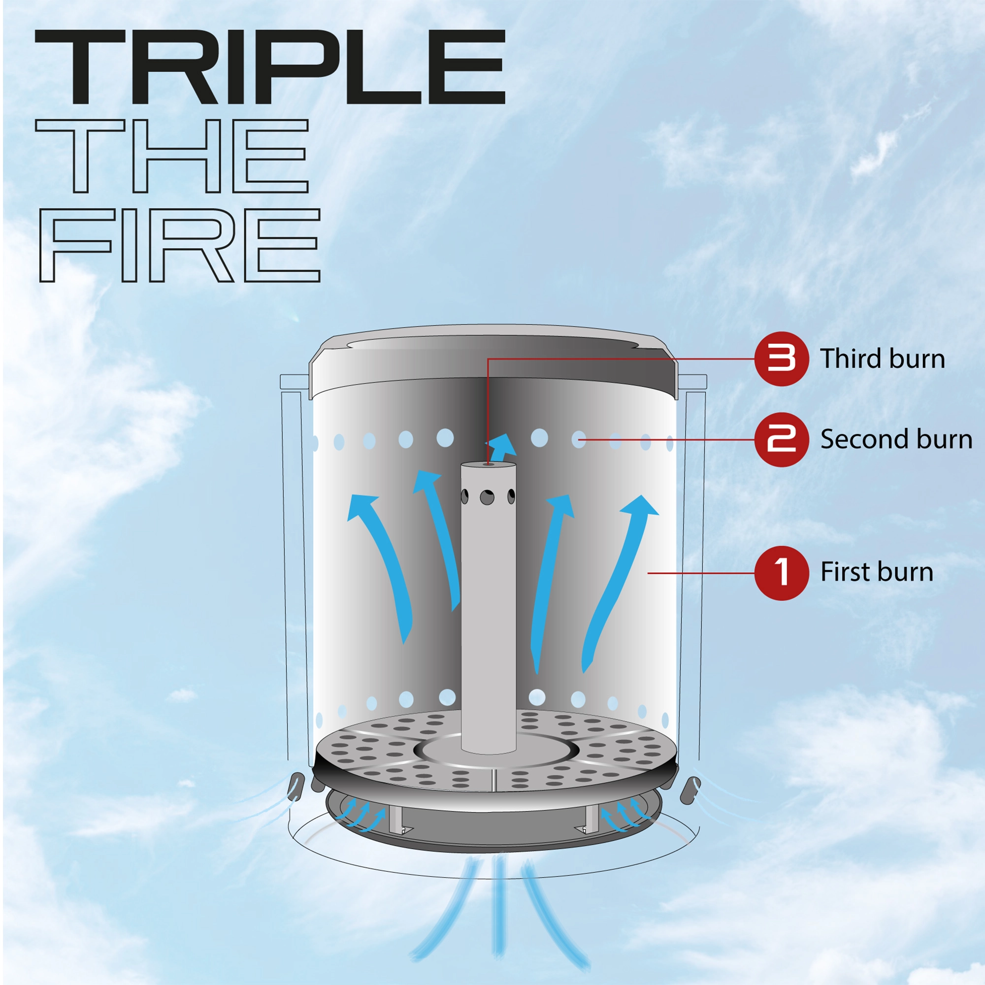 Üç noktadan alev çıkışı sağlayan Triple Flame teknolojisi sayesinde dengeli ve büyüleyici bir ateş oluşur. Çift cidarlı silindirik yapısı ve alt hava kanalları, maksimum oksijen akışı sağlayarak hem dumanı hem de kıvılcımı minimuma indirir. Doğru odun veya pelet kullanımıyla neredeyse dumansız, kokusuz ve zahmetsiz bir kullanım sunar.